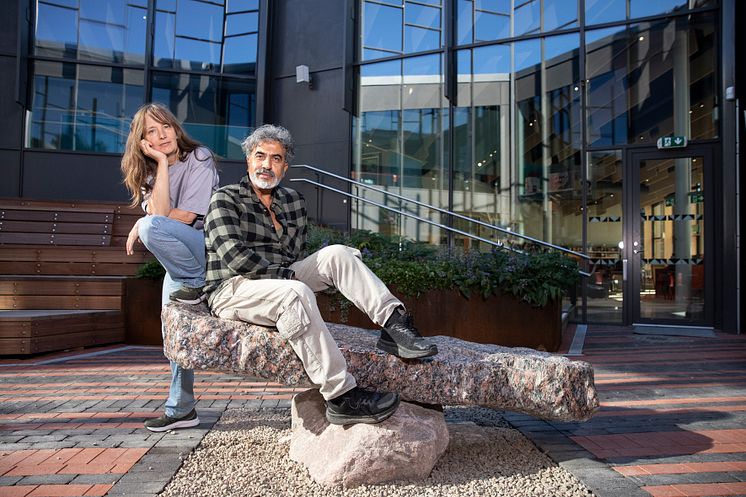 Jelena Rundqvist och Haky Jasim, på skulpturen "Gungascenen". Del av konstgestaltningen "By Bergsjön".