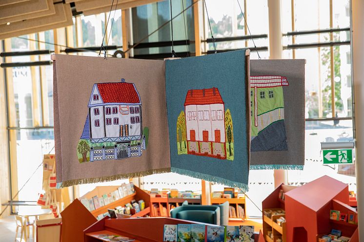 En grupp kvinnor från Kvinnocenter i Bergsjön har broderat de hem de en gång tvingats fly ifrån. Broderierna hänger som en mobil nära bibliotekets barnavdelning i kulturhuset.