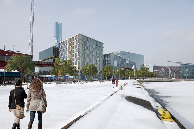 Vy över konceptförslag på framtida byggnader inom Geelys innovationscentrum ut mot Pumpgatan. Byggnaden närmast innehåller hotell, byggnaden i mitten Geelys designcenter och byggnaden längst bort Geelys kontorskvarter. Vyn är tagen från Keillerkajen vilken föreslås ska utvecklas till hållplats för kollektivtrafik med färja.