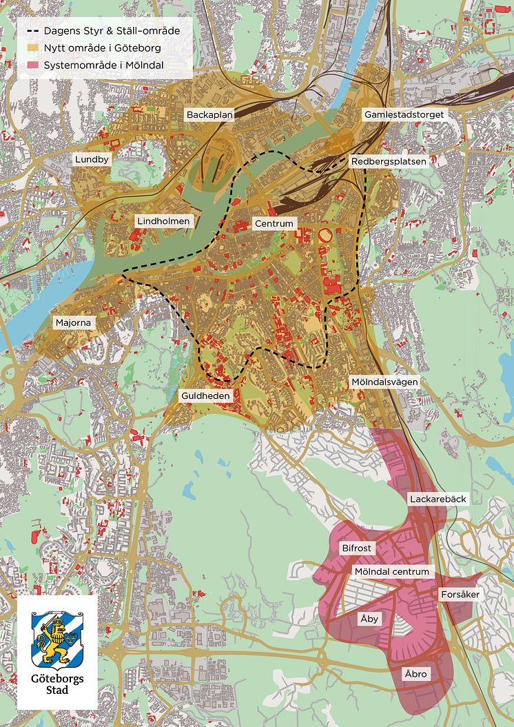 Kartan visar det planerade lånecykelsystemet Styr & Ställ i Göteborg och Mölndal från våren 2020. Systemet upphandlas hösten 2018.