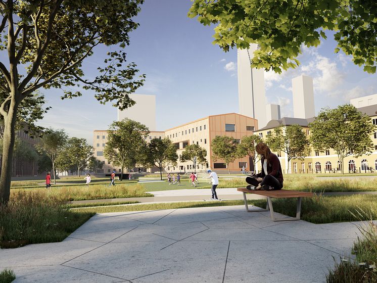 Konceptförslag över skolbyggnad och skolgård, vy från Planetgatans föreslagna förlängning.