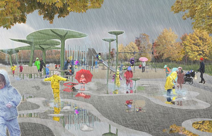 Illustrationsbild till regnlekplatsen i Renströmsparken, Centrum, Göteborg, som invigs 8 december 2018. Regnlekplatsen är en del av jubileumssatsningen "Rain Gothenburg" inför Göteborgs 400-årsjubileum år 2021.