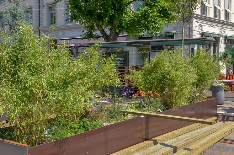 Bygget pågår av den tillfälliga, grönskande mötesplatsen på den avstängda hållplatsen vid Grönsakstorget i centrala Göteborg.