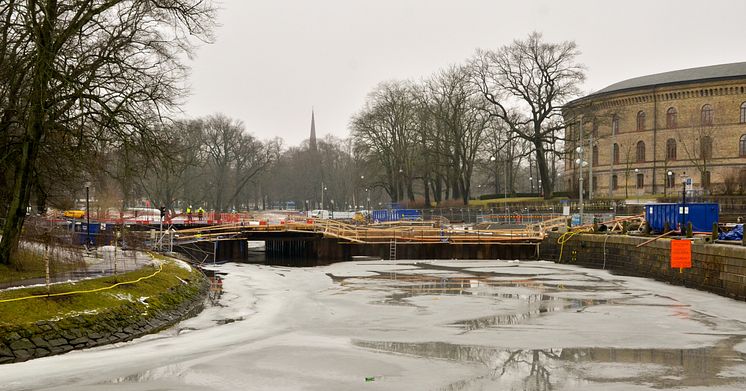 Vasabron över Vallgraven i centrala Göteborg. Till höger Pedagogen vid Grönsakstorget, i bakgrunden Hagakyrkan.