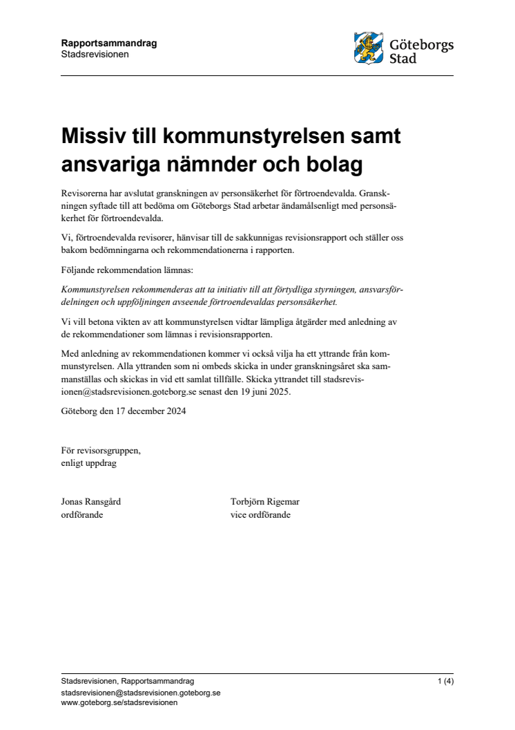 Stadsrevisionen har granskat hur Göteborgs Stad arbetar med personsäkerheten för politiker. Granskningen visar att det saknas beslut om hur arbetet ska bedrivas och att många verksamheter saknar rutiner för hur de ska omhänderta politikernas säkerhet. De säkerhetsansvariga upplever dessutom ansvarsfördelningen som otydlig.