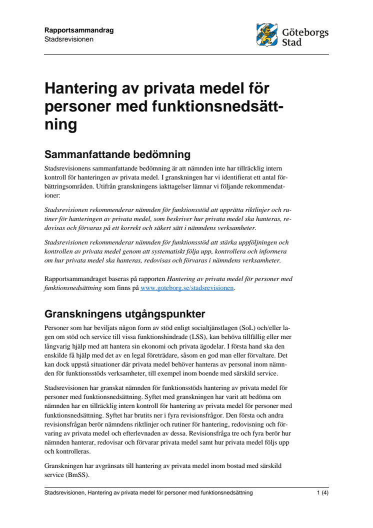 Stadsrevisionen har granskat hur nämnden för funktionsstöd hanterar privata medel för personer med funktionsnedsättning. Granskningen visar att nämnden saknar riktlinjer och rutiner samt att de brister i hantering, redovisning och förvaring. Det saknas till exempel skriftliga överenskommelser om hanteringen. Kassaböcker är inte upprättade på ett korrekt sätt och ibland saknas de helt. Det förekommer även att kassaskrin har förvarats olåsta.
