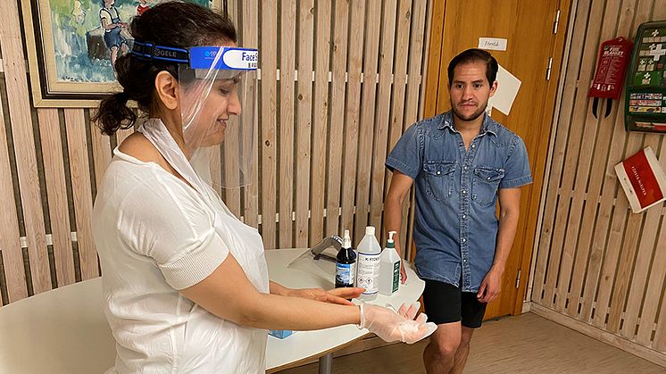 Teamet instruerar personalen i hur de ska ta på och av skyddskläder, hur de ska göra rent sina visir och pratar om hur viktiga basala hygienrutiner är. De tycker uppdraget att få komma ut i verksamheterna och informera muntligt är viktigt.