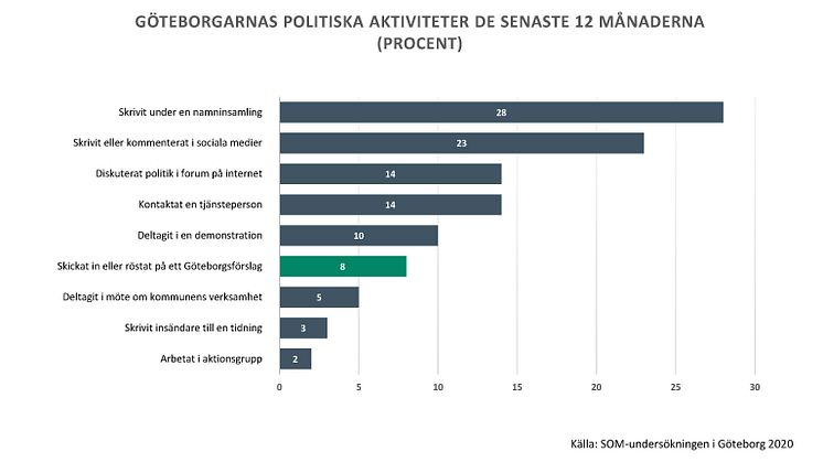 För första gången ställdes en fråga om den digitala förslagslådan ”Göteborgsförslaget”. 8 procent av de svarande uppgav att de lämnat eller signerat ett göteborgsförslag det senaste året.