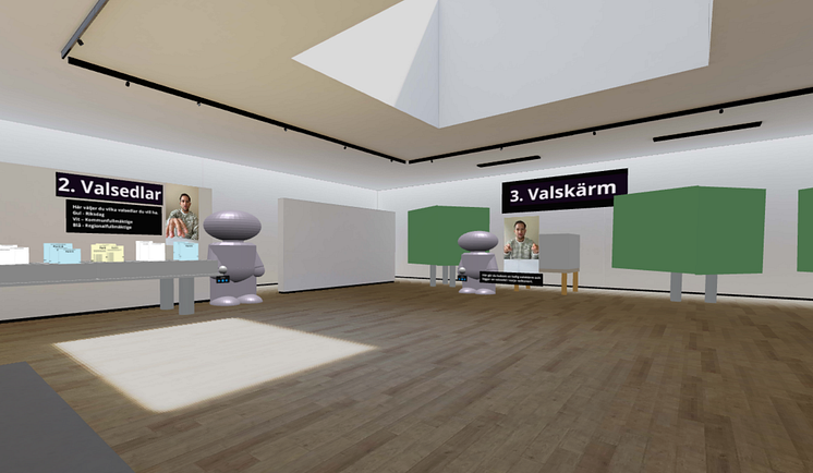 I den virtuella världen fick deltagarna gå igenom de olika stegen i att rösta i en vallokal eller förtidsröstningslokal. Det handlade om att ta emot valkuverten som man ska lägga valsedlarna i, gå bakom båset för att stoppa sina valsedlar i kuverten och sedan lämna dem till röstmottagaren.