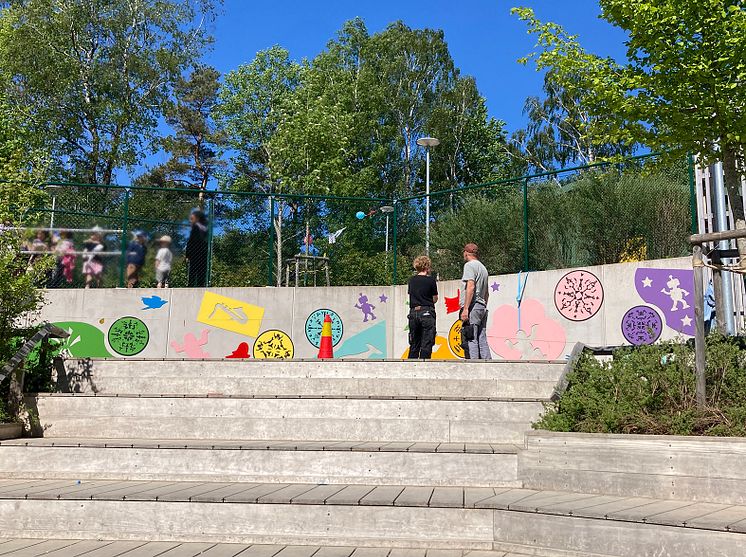 ”Kosmoskonsert”, Ingrid Sandsborg. Gestaltning på stödmur, Orkestergatans förskola. Finansiär och processledare genom enprocentregeln: stadsfastighetsförvaltningen.