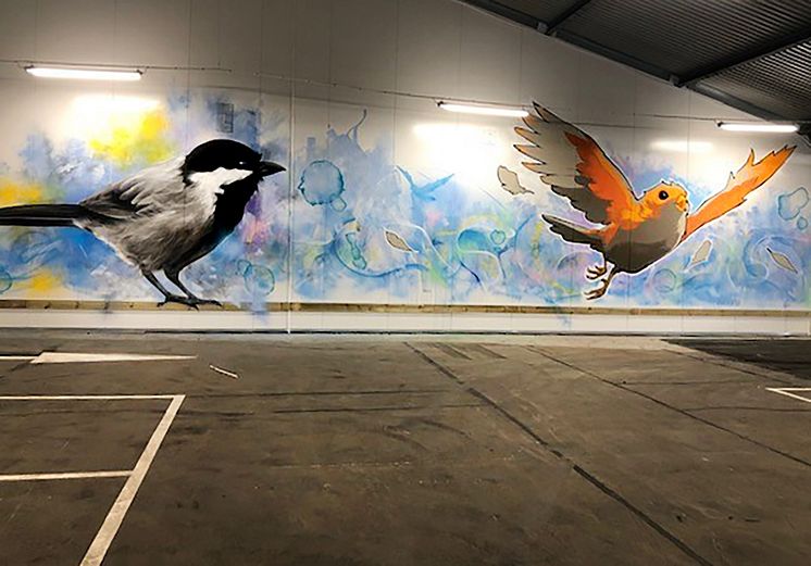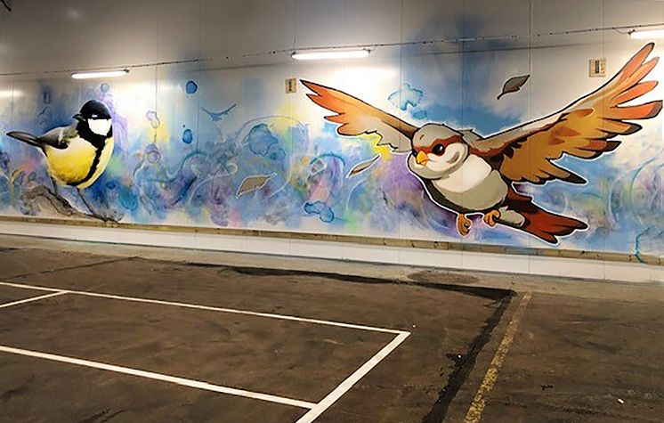 ”Fågelvägen”, Christofer ”Sagie” Siwertz-Svedjeby och Tony ”Tony-B” Boufadene. Muralmålning, P-hus Centralen. Finansiär och processledare: Göteborgs Stads Parkering.