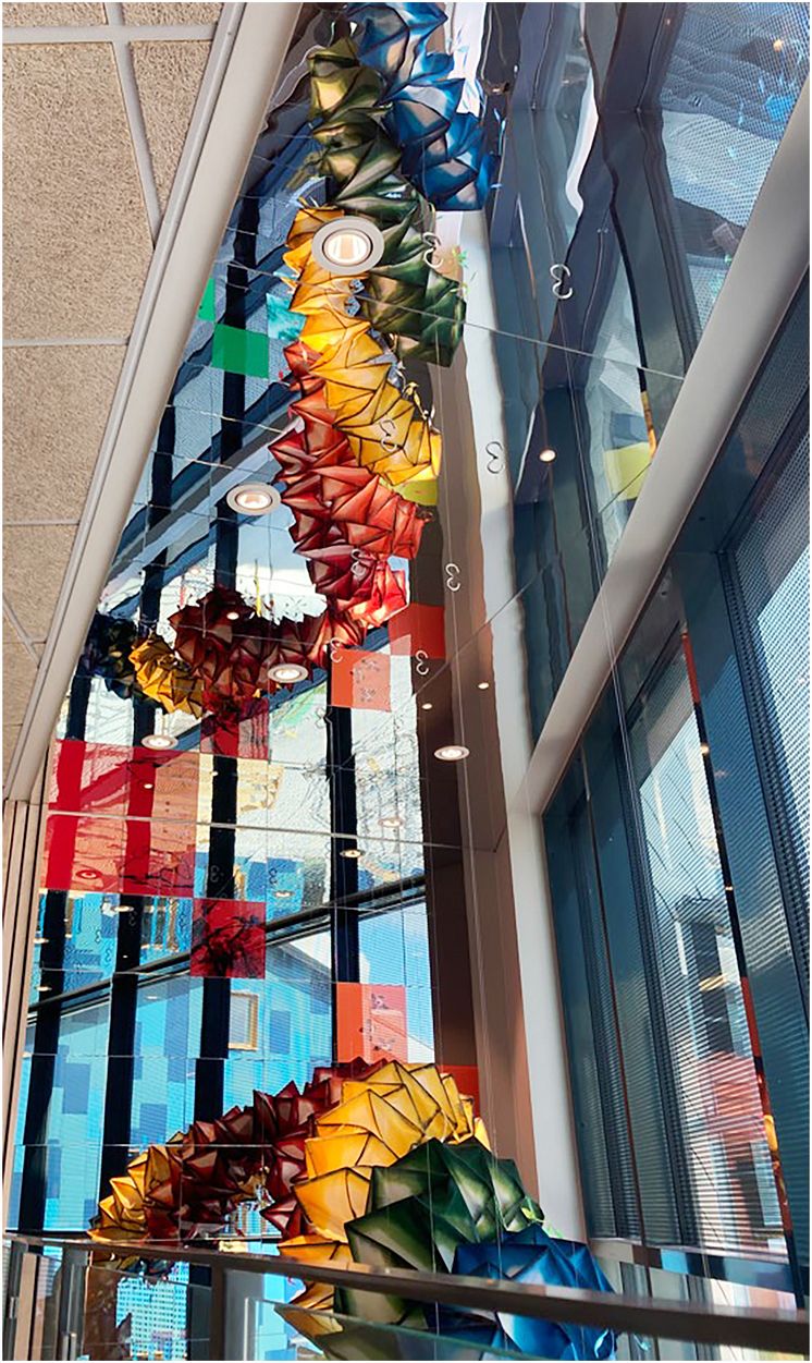 ”Efter regn kommer regnbåge”, Leyun Wang. Gestaltning inomhus i tre plan, Torslandaskolan. Finansiär och processledare genom enprocentregeln: stadsfastighetsförvaltningen.
