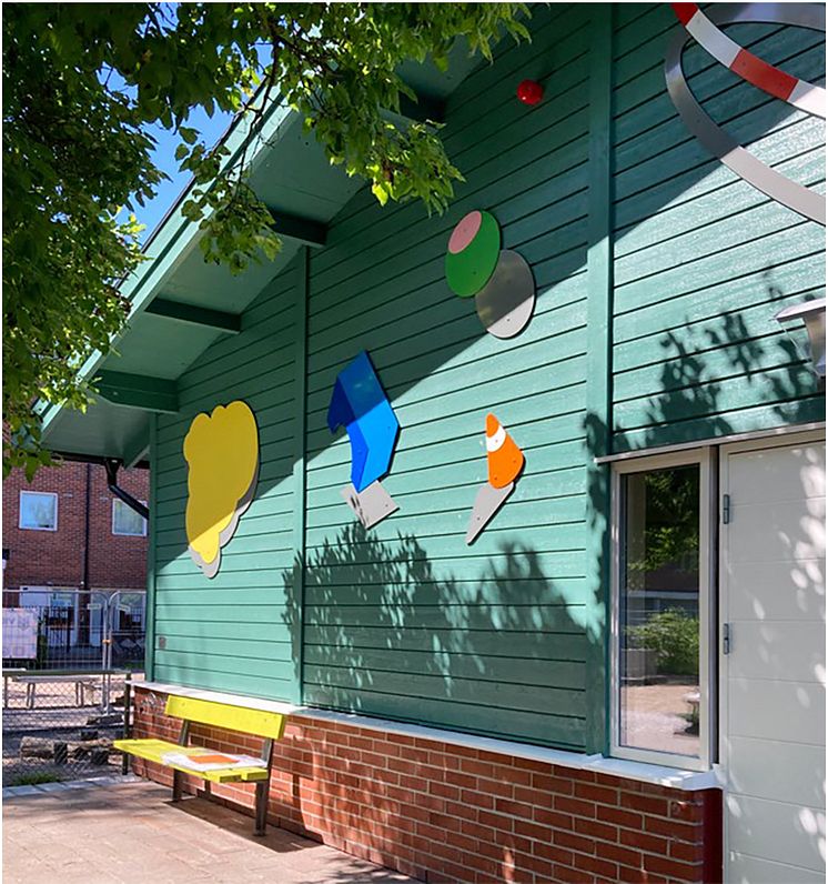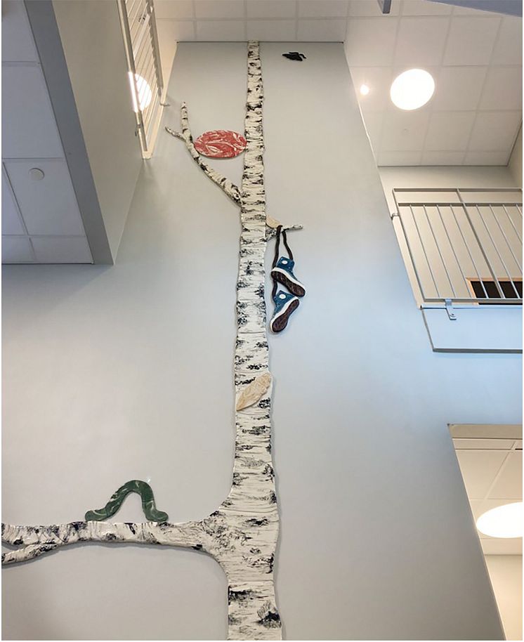 I konstverket ingår också en fönstermålning med abstrakta fjärilsvingar, som sitter på fönstret i barnens ateljé.