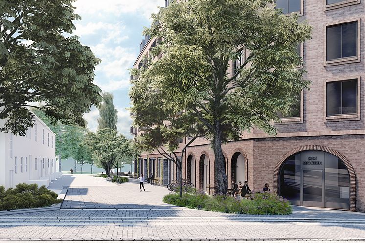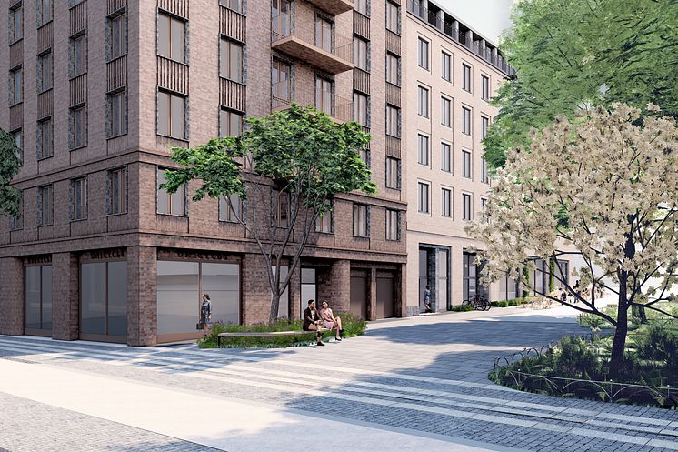 Kvarterets öppna struktur följs genom att den offentliga miljön med park, alléer, stråk och torgrum tar plats runtom bebyggelsen som utförs med publikt innehåll i bottenvåningen. Planförslaget innebär att befintligt parkeringshus rivs. De allmänna parkeringsplatserna kan till viss del ersättas i ett nytt parkeringsgarage under mark.