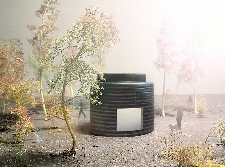I ett grönområde i anslutning till station Haga placeras en skulptur i form av en rund paviljong, med ett vågformat, ljusreflekterande ytskikt av basalt. På ena sidan går det att kika in i paviljongen genom ett fönster. Inuti finns en betongtratt som innehåller materialet beck (”pitch” på engelska).