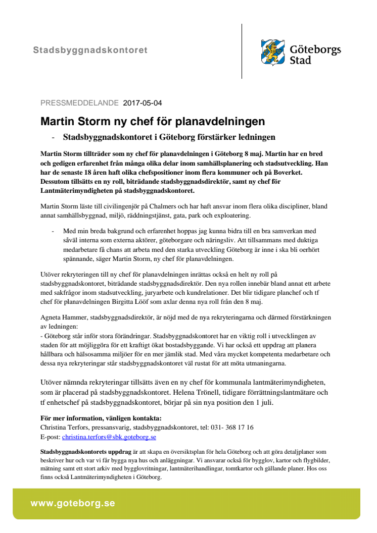 • Martin Storm ny chef för planavdelningen - Stadsbyggnadskontoret i Göteborg förstärker ledningen