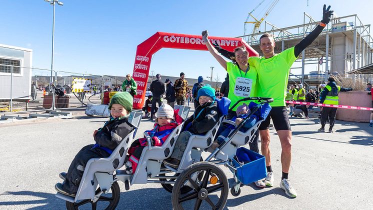 Strax före 15.00 på lördag kan Göteborg ha en ny världsrekordinnehavare. Johan Skårbratt tar sig nämligen an utmaningen att ta plats i Guiness rekordbok som den som sprungit ett halvmaraton snabbast med fyra barn.