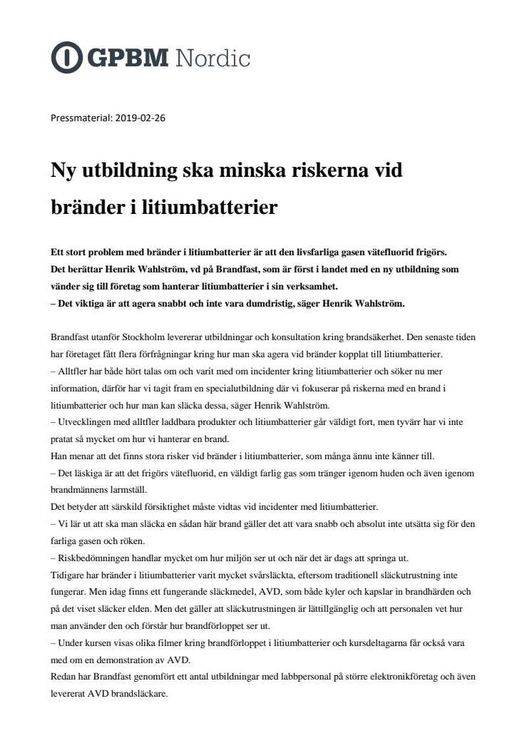 Det berättar Henrik Wahlström, vd på Brandfast, som är först i landet med en ny utbildning som vänder sig till företag som hanterar litiumjonbatterier i sin verksamhet.