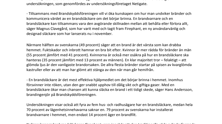 Närmare hälften av svenskarna (49 procent) säger att en brand är det värsta som kan drabba hemmet. Fuktskador och inbrott hamnar en bra bit efter. Kvinnor är mer rädda för bränder än män (55 procent jämfört med 41 procent). Kvinnorna är också mer osäkra på hur en brandsläckare ska hanteras (35 procent jämfört med 13 procent av männen). En klar majoritet tror – felaktigt – att glömda ljus är den vanligaste brandorsaken. De allra flesta bränder startar på spisen av kvarglömda kastruller eller av att man har glömt att stänga av den när man går hemifrån.