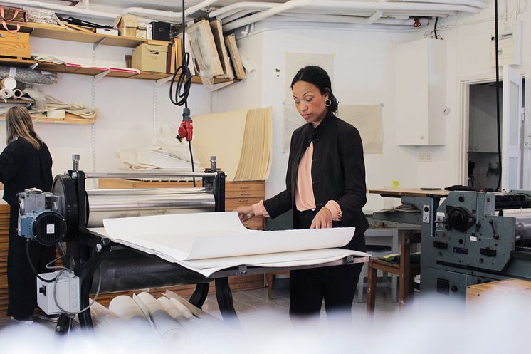 Frida Orupabo i verkstaden foto Anna Henriksson Grafikens Hus