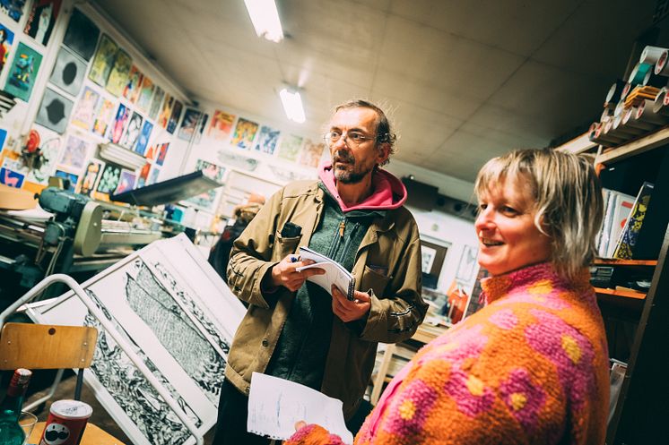 Konstnärerna Anna Ehrlemark och Mileta Mijatović, Longest Night i Kortedala, en screentryckverkstad och en plats som upplöser gränsen mellan självorganiserad kulturpraktik och professionell konst.