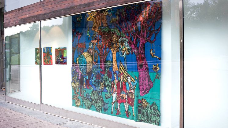 Mönstrade och enfärgade tyger utgör underlaget för Fredrik Lindqvists expressiva träsnitt som Grafikens Hus ställer ut i Konstfönstret på Köpmannagatan 1 i Södertälje.