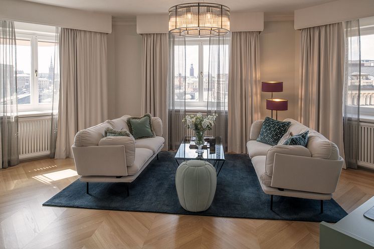 Renoverade rum och sviter på våning 5 och 6, Grand Hôtel Stockholm. Rummen och sviterna renoverades under 2022. Inredare: Fanny Widén