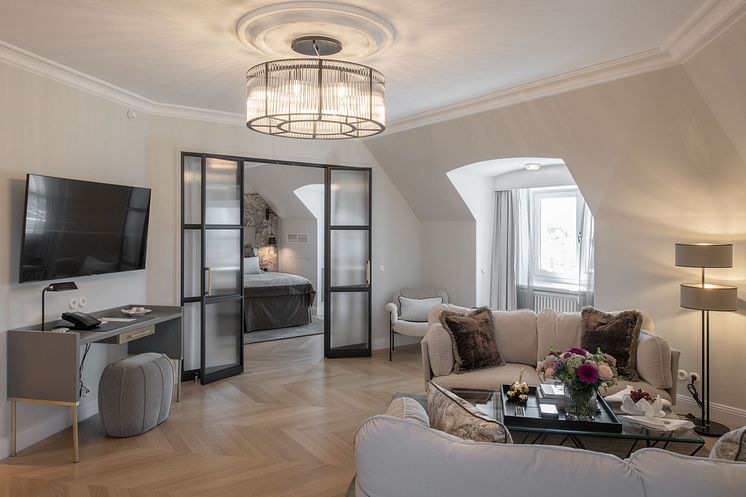Renoverade rum och sviter på våning 5 och 6, Grand Hôtel Stockholm. Rummen och sviterna renoverades under 2022. Inredare: Fanny Widén