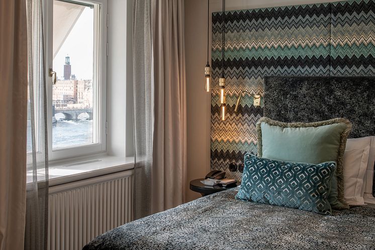 Renoverade rum och sviter på våning 5 och 6, Grand Hôtel Stockholm. Rummen och sviterna renoverades under 2022. Inredare: Fanny Widén