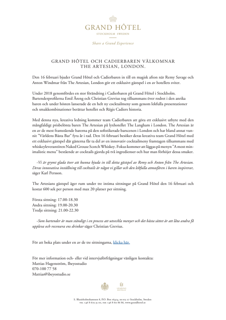 Med denna nya, kreativa ledning kommer team Cadierbaren att göra ett exklusivt utbyte med den mångfaldigt prisbelönta baren The Artesian på lyxhotellet The Langham i London. The Artesian är en av de mest framstående barerna på den sofistikerade barscenen i London och har bland annat vunnit ”Världens Bästa Bar” fyra år i rad. Den 16 februari besöker deras kreativa team Grand Hôtel med ett exklusivt gästspel där gästerna får ta del av en innovativ cocktailmeny framtagen tillsammans med whiskeyleverantören Naked Grouse Scotch Whiskey. Fokus kommer att läggas på menyn ”A most minimalistic menu” bestående av cocktails gjorda på två ingredienser och hur man förhöjer dessa smaker.