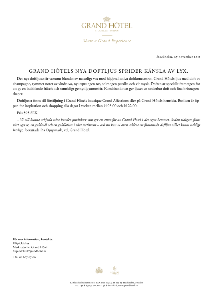 – Vi vill kunna erbjuda våra kunder produkter som ger en atmosfär av Grand Hôtel i det egna hemmet. Sedan tidigare finns vårt eget te, en guldtvål och en guldlotion i vårt sortiment – och nu kan vi även addera ett fantastiskt doftljus vilket känns väldigt härligt, berättar Pia Djupmark vd på Grand Hôtel.