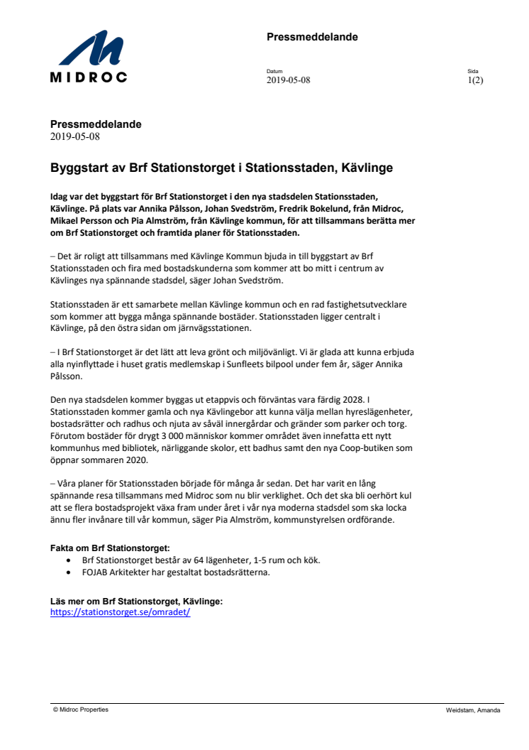 Idag var det byggstart för Brf Stationstorget i den nya stadsdelen Stationsstaden, Kävlinge. På plats var Annika Pålsson, Johan Svedström, Fredrik Bokelund, från Midroc, Mikael Persson och Pia Almström, från Kävlinge kommun, för att tillsammans berätta mer om Brf Stationstorget och framtida planer för Stationsstaden.