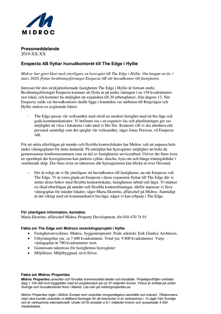 Midroc har gjort klart med ytterligare en hyresgäst till The Edge i Hyllie. Om knappt ett år, i mars 2020, flyttar besiktningsföretaget Enspecta AB sitt huvudkontor till fastigheten.