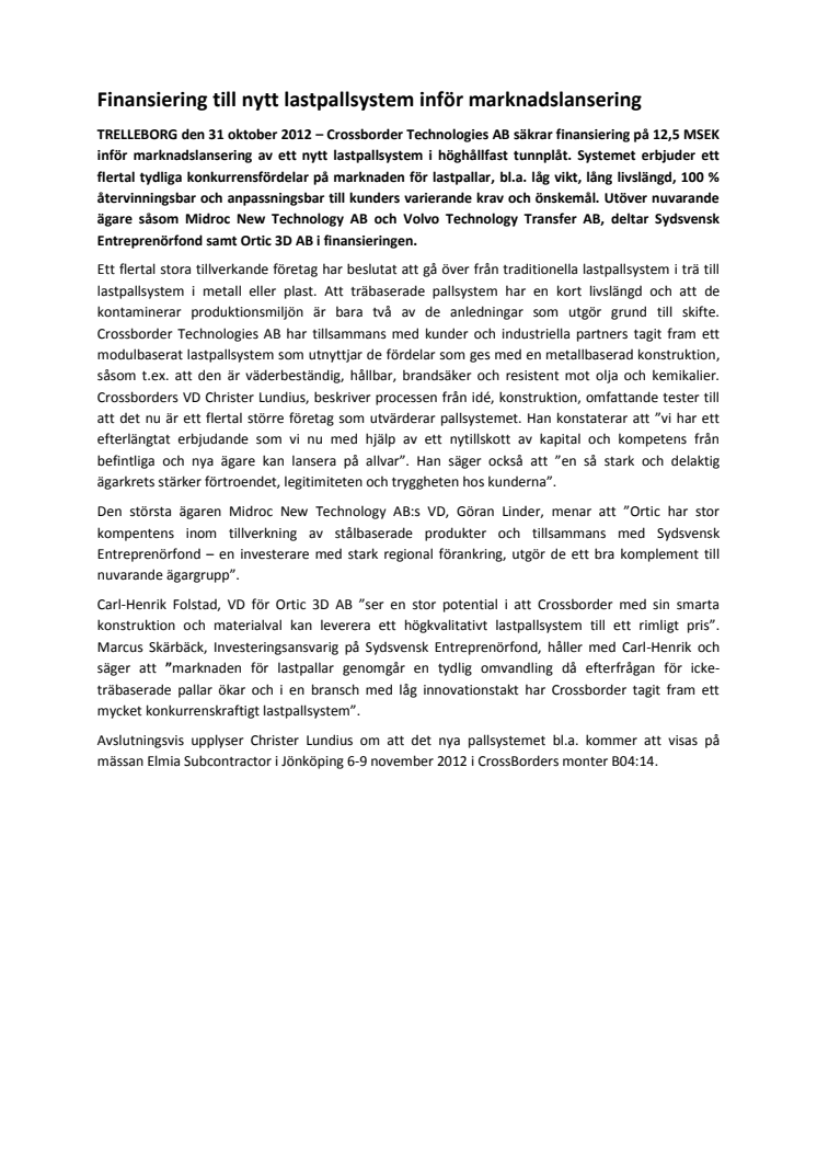 Crossborder Technologies AB säkrar finansiering på 12,5 MSEK inför marknadslansering av ett nytt lastpallsystem i höghållfast tunnplåt. Systemet erbjuder tydliga konkurrensfördelar, bla. låg vikt, lång livslängd, återvinnings- och anpassningsbar. Utöver de nuvarande ägarna Midroc New Technology AB och Volvo Technology Transfer AB, deltar Sydsvensk Entreprenörfond samt Ortic 3D AB i finansieringen.