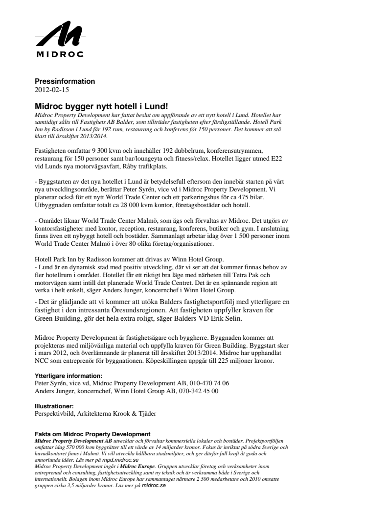 Midroc Property Development har fattat beslut om uppförande av ett nytt hotell i Lund. Hotellet har samtidigt sålts till Fastighets AB Balder, som tillträder fastigheten efter färdigställande. Hotell Park Inn by Radisson i Lund får 192 rum, restaurang och konferens för 150 personer. Det kommer att stå klart till årsskiftet 2013/2014.