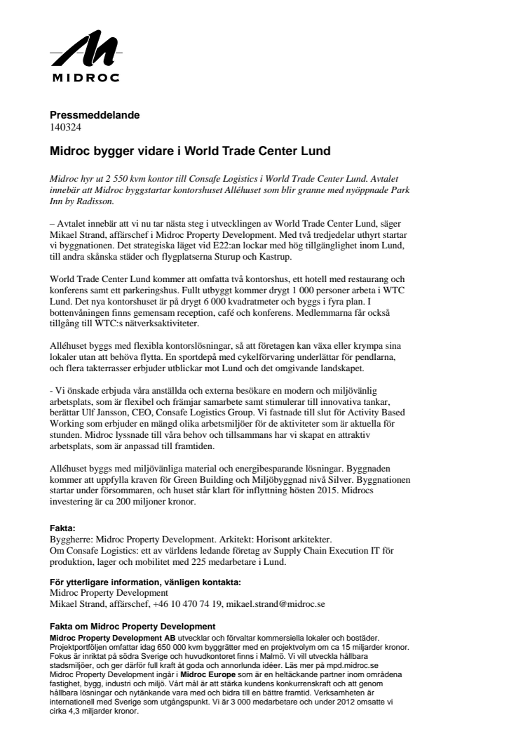 Midroc hyr ut 2 550 kvm kontor till Consafe Logistics i World Trade Center Lund. Avtalet innebär att Midroc byggstartar kontorshuset Alléhuset som blir granne med nyöppnade Park Inn by Radisson.