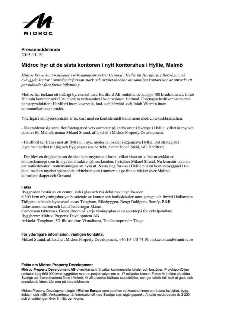 Midroc hyr ut kontorslokaler i nybyggnadsprojektet Hermod i Hyllie till Hardford. Efterfrågan på nybyggda kontor i området är fortsatt stark och avtalet innebär att samtliga kontorsytor är uthyrda ett par månader före första inflyttning.