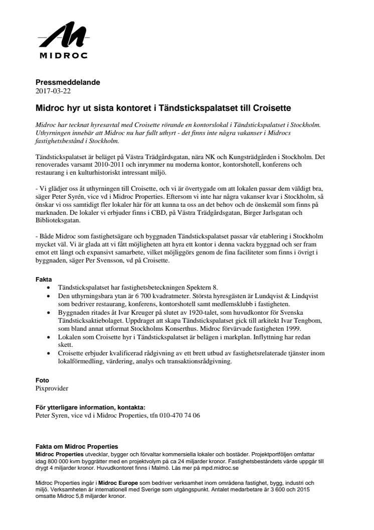 Midroc har tecknat hyresavtal med Croisette rörande en kontorslokal i Tändstickspalatset i Stockholm. Uthyrningen innebär att Midroc nu har fullt uthyrt - det finns inte några vakanser i Midrocs fastighetsbestånd i Stockholm.