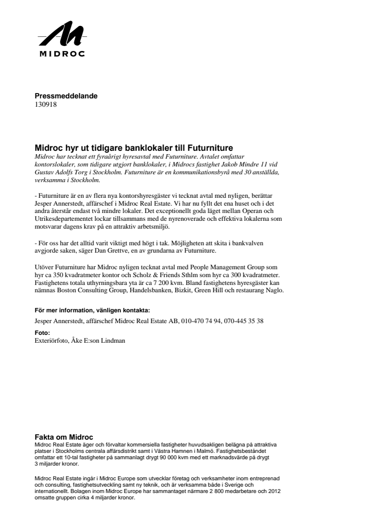 Midroc har tecknat ett fyraårigt hyresavtal med Futurniture. Avtalet omfattar kontorslokaler, som tidigare utgjort banklokaler, i Midrocs fastighet Jakob Mindre 11 vid Gustav Adolfs Torg i Stockholm. Futurniture är en kommunikationsbyrå med 30 anställda, verksamma i Stockholm.