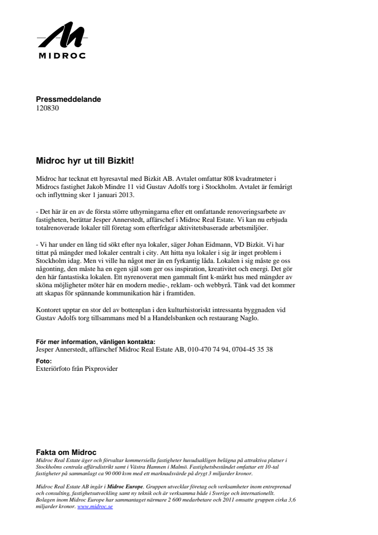 Midroc har tecknat ett hyresavtal med Bizkit AB. Avtalet omfattar 808 kvadratmeter i Midrocs fastighet Jakob Mindre 11 vid Gustav Adolfs torg i Stockholm. Avtalet är femårigt och inflyttning sker 1 januari 2013.