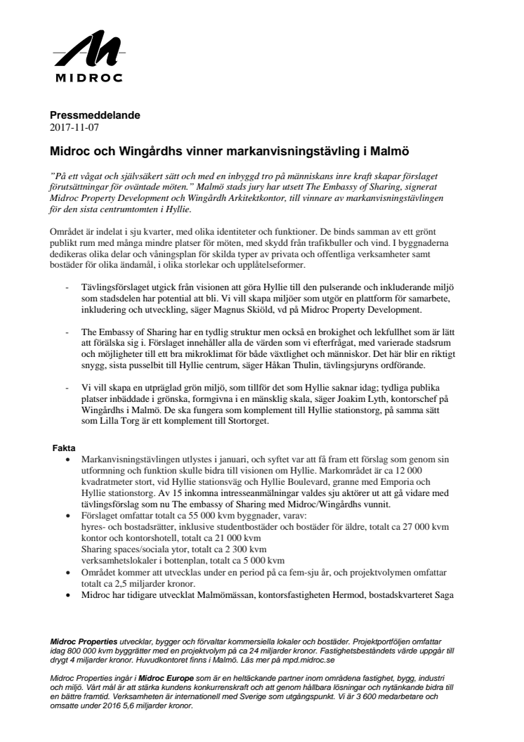 ”På ett vågat och självsäkert sätt och med en inbyggd tro på människans inre kraft skapar förslaget förutsättningar för oväntade möten.” Malmö stads jury har utsett The Embassy of Sharing, signerat Midroc Property Development och Wingårdh Arkitektkontor, till vinnare av markanvisningstävlingen för den sista centrumtomten i Hyllie.