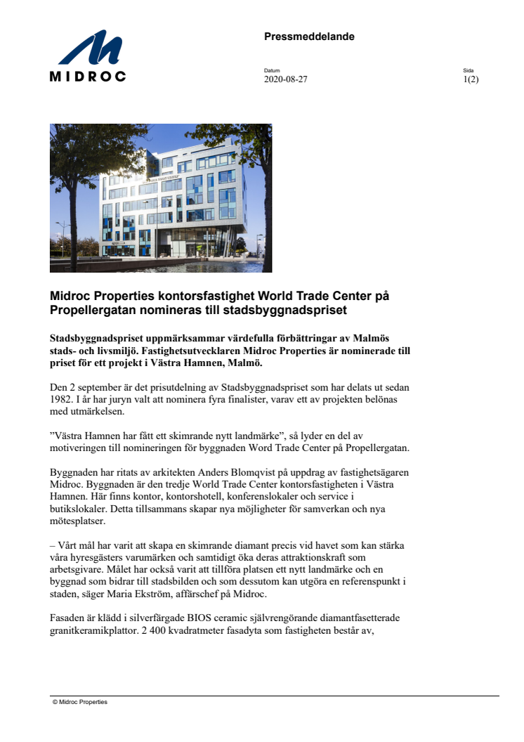 Midroc Properties kontorsfastighet World Trade Center på Propellergatan nomineras till stadsbyggnadspriset