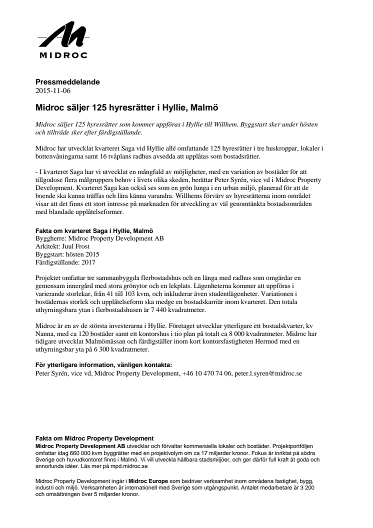 Midroc säljer 125 hyresrätter som kommer uppföras i Hyllie till Willhem. Byggstart sker under hösten och tillträde sker efter färdigställande.