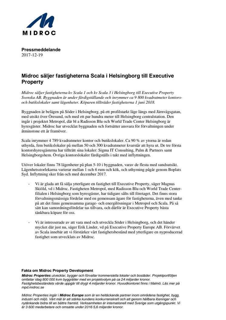 Midroc säljer fastigheterna kv Scala 1 och kv Scala 3 i Helsingborg till Executive Property Svenska AB. Byggnaden är under färdigställande och inrymmer ca 9 800 kvadratmeter kontors- och butikslokaler samt lägenheter. Köparen tillträder fastigheterna 1 juni 2018.