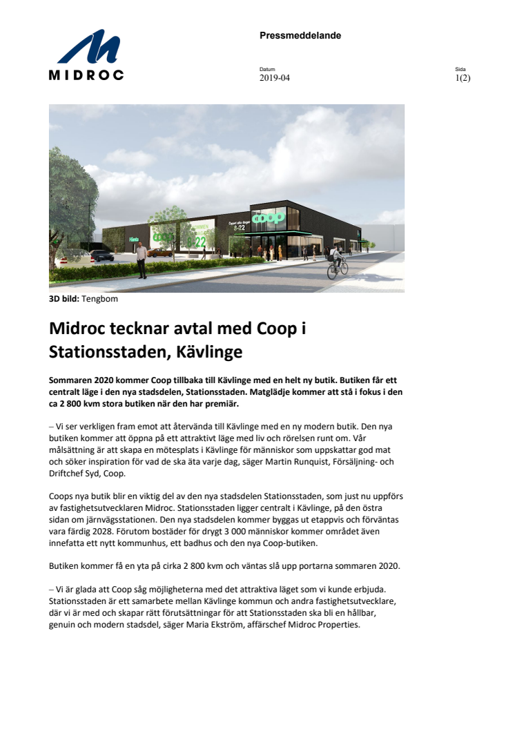 Midroc tecknar avtal med Coop i Stationsstaden, Kävlinge