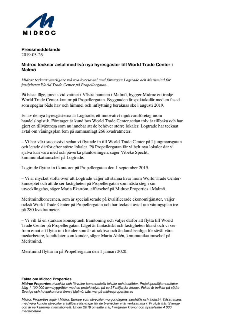 Midroc tecknar ytterligare två nya hyresavtal med företagen Logtrade och Meritmind för fastigheten World Trade Center på Propellergatan.