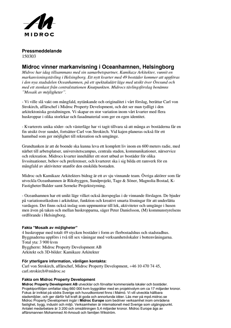 Midroc har idag tillsammans med sin samarbetspartner, Kamikaze Arkitekter, vunnit en markanvisningstävling i Helsingborg. Ett nytt kvarter med 49 bostäder kommer att uppföras i den nya stadsdelen Oceanhamnen, på ett spektakulärt läge med utsikt över Öresund och med ett stenkast från centralstationen Knutpunkten. Midrocs tävlingsförslag benämns ”Mosaik av möjligheter”.