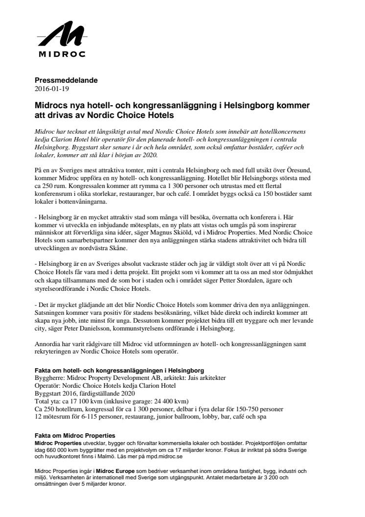 Midroc har tecknat ett långsiktigt avtal med Nordic Choice Hotels som innebär att hotellkoncernens kedja Clarion Hotel blir operatör för den planerade hotell- och kongressanläggningen i centrala Helsingborg. Byggstart sker senare i år och hela området, som också omfattar bostäder, caféer och lokaler, kommer att stå klar i början av 2020.