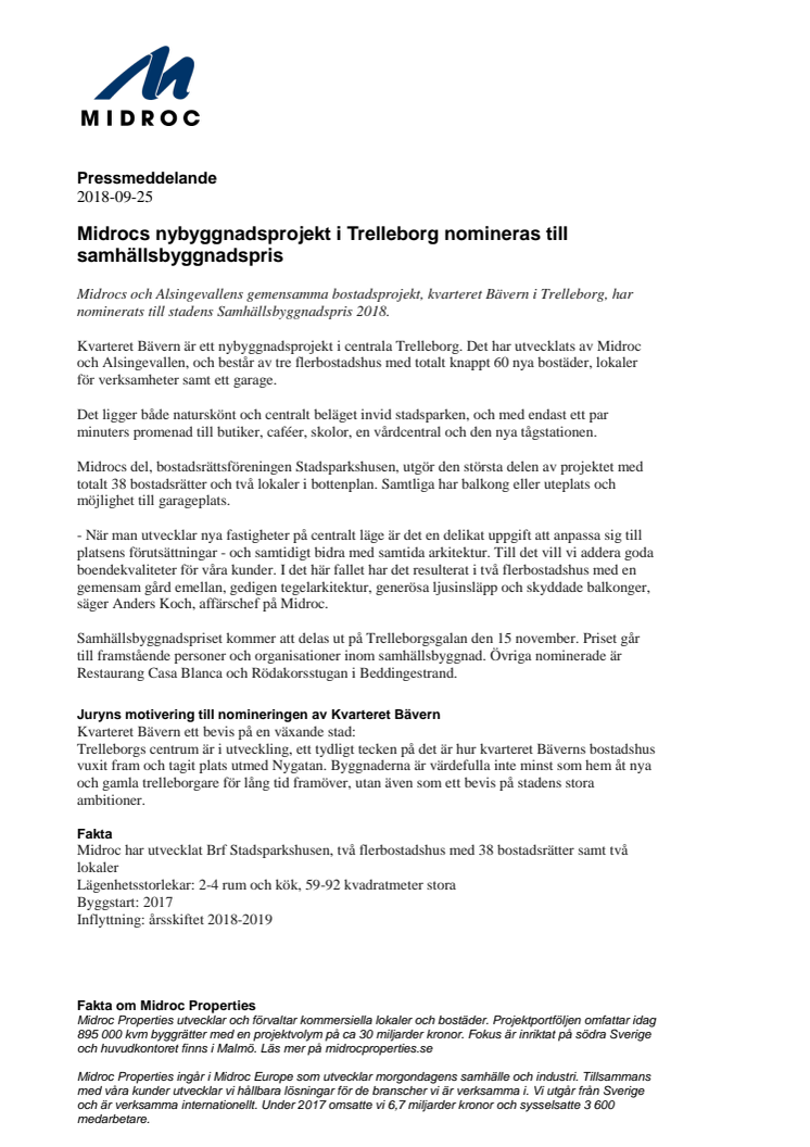 Midrocs och Alsingevallens gemensamma bostadsprojekt, kvarteret Bävern i Trelleborg, har nominerats till stadens Samhällsbyggnadspris 2018.
