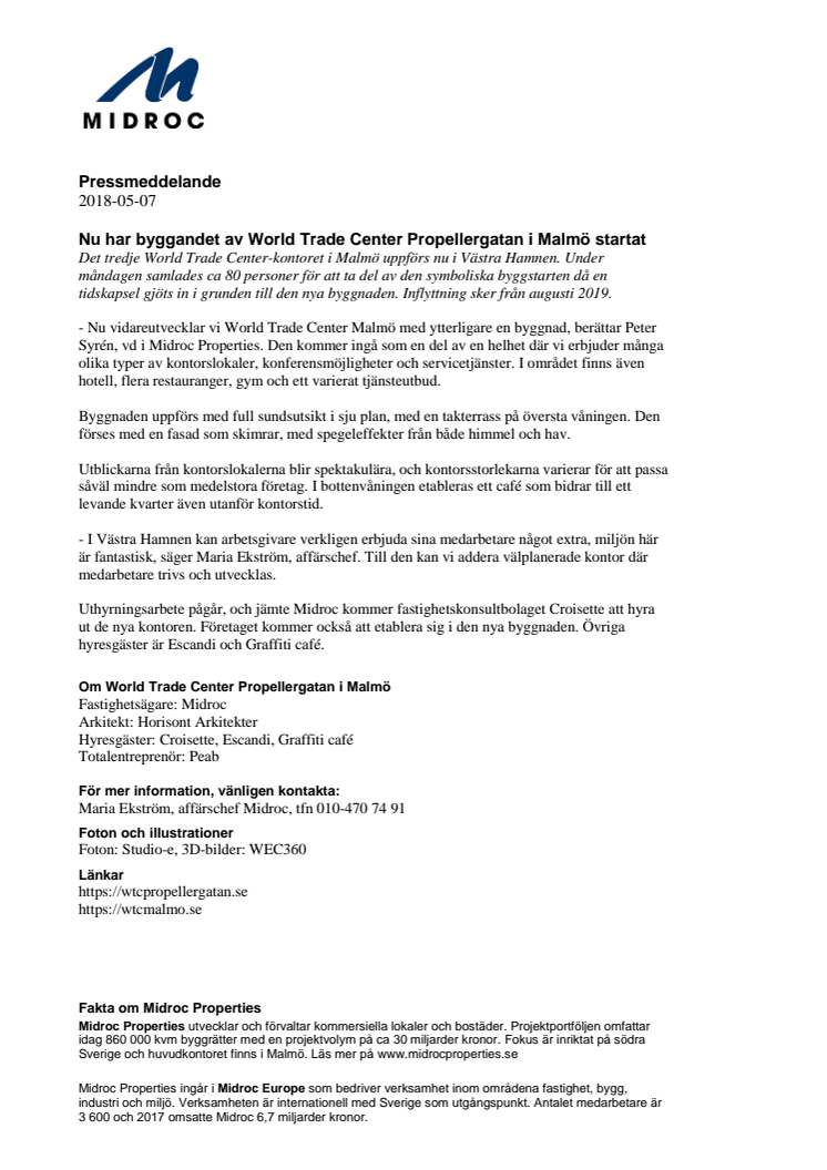 Det tredje World Trade Center-kontoret i Malmö uppförs nu i Västra Hamnen. Under måndagen samlades ca 80 personer för att ta del av den symboliska byggstarten då en tidskapsel gjöts in i grunden till den nya byggnaden. Inflyttning sker från augusti 2019.